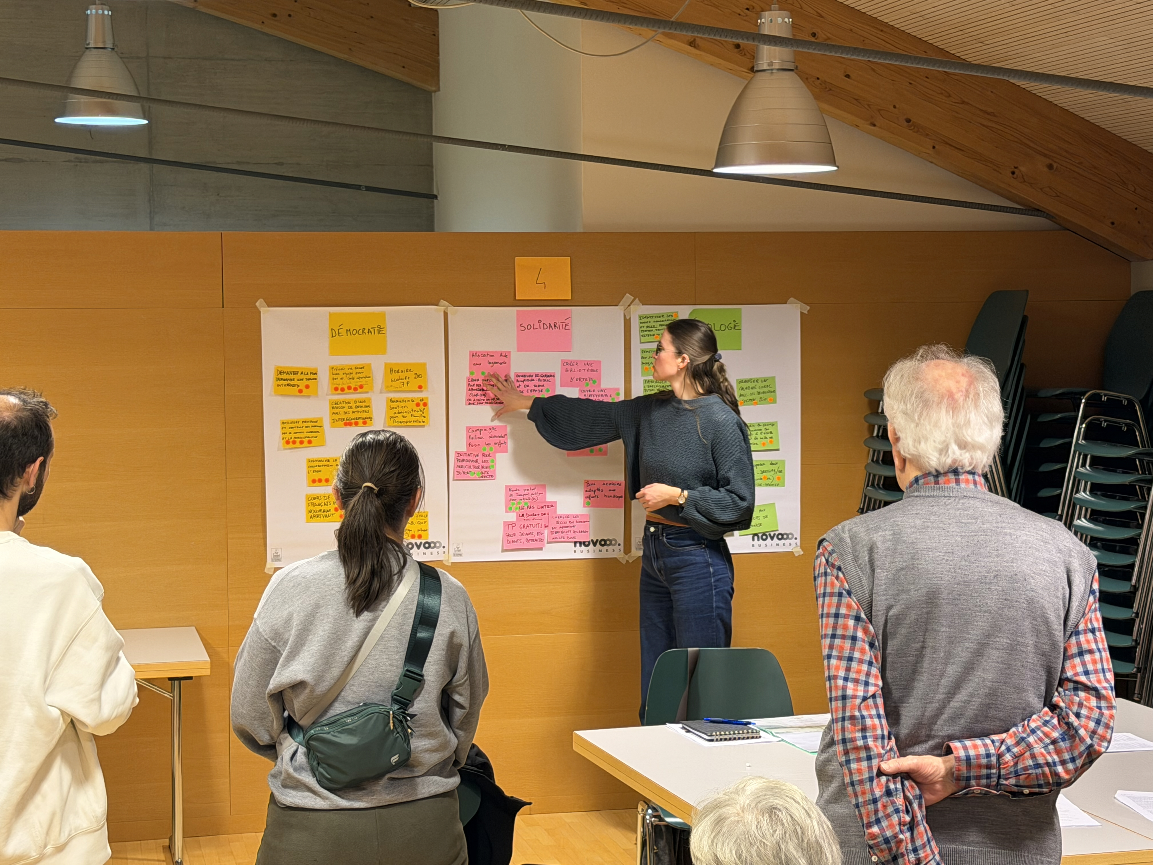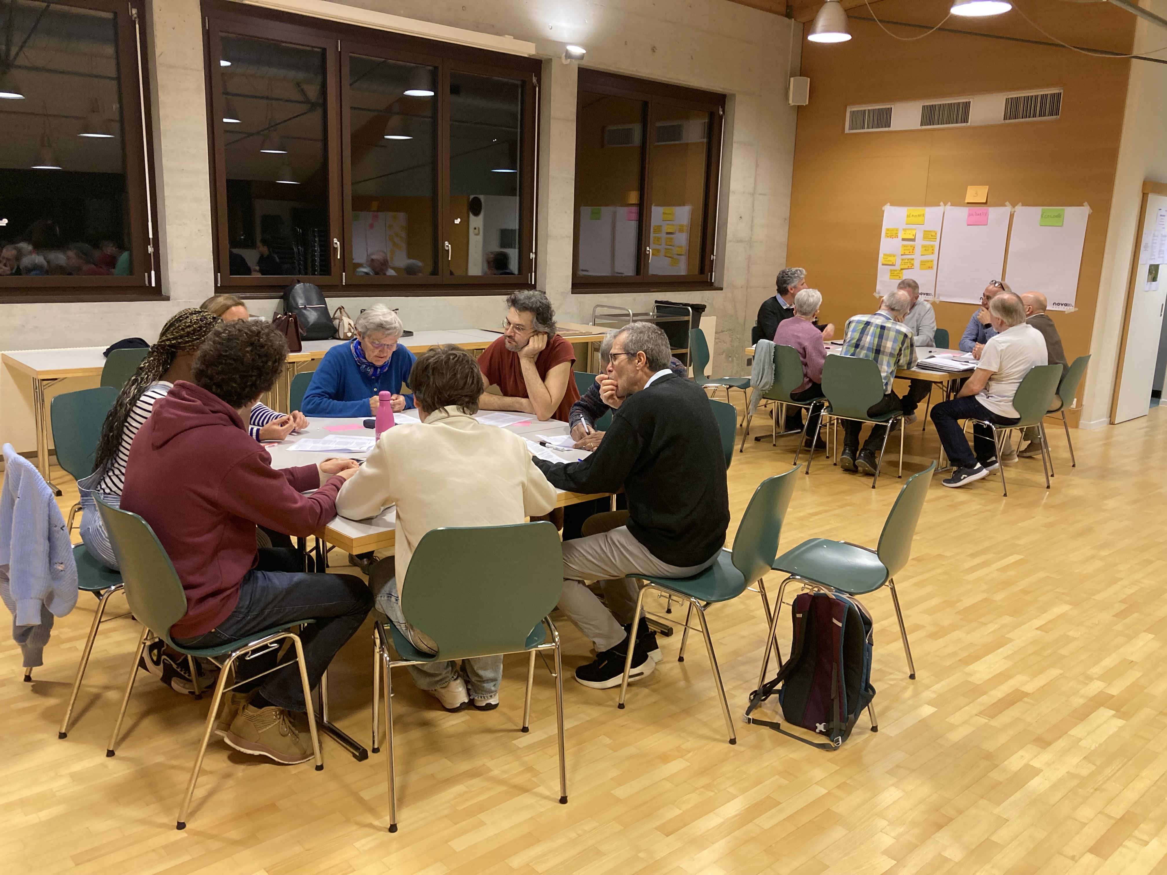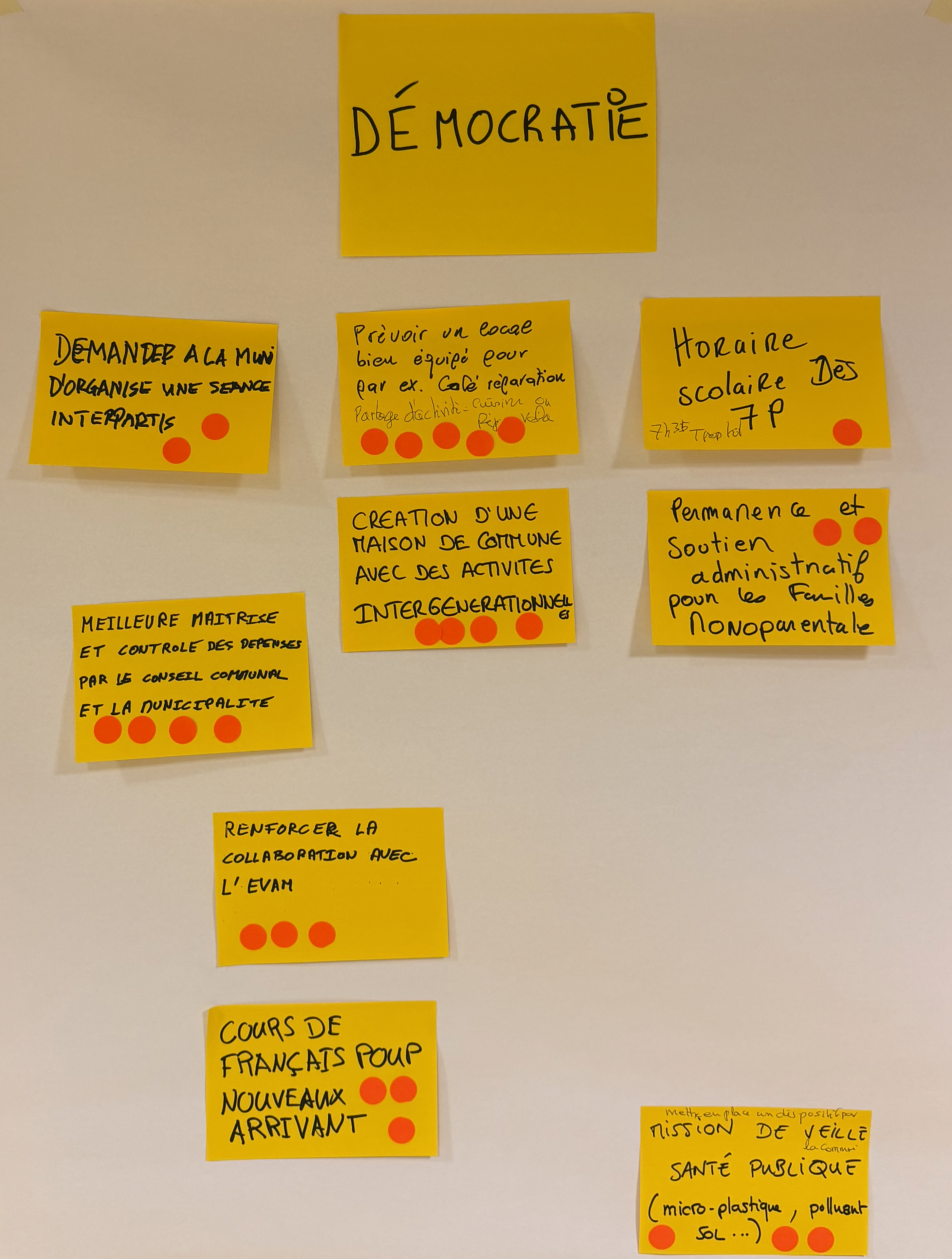 La soirée s’est déroulée selon le même synopsis qu’en 2015 et 2021 : chaque groupe a travaillé sur chaque pilier (Démocratie, Solidarité, Écologie) pendant un cycle de 20′ et a présenté ses résultats à toute l’assemblée au terme des 3 cycles. Pendant chaque cycle, les groupes ont décrits leurs idées sur des post-its et votés pour leur priorités avec des gommettes autocollantes.