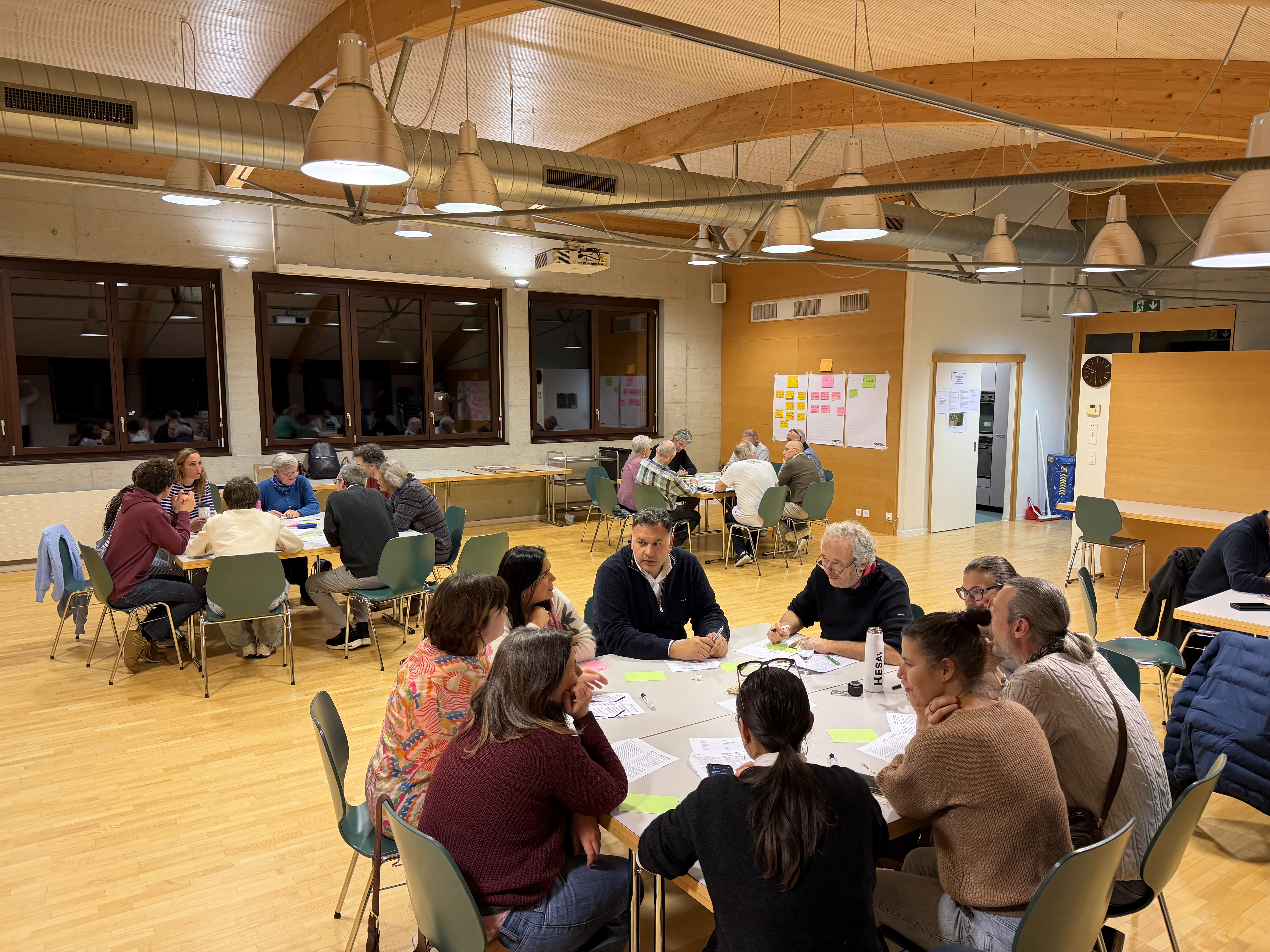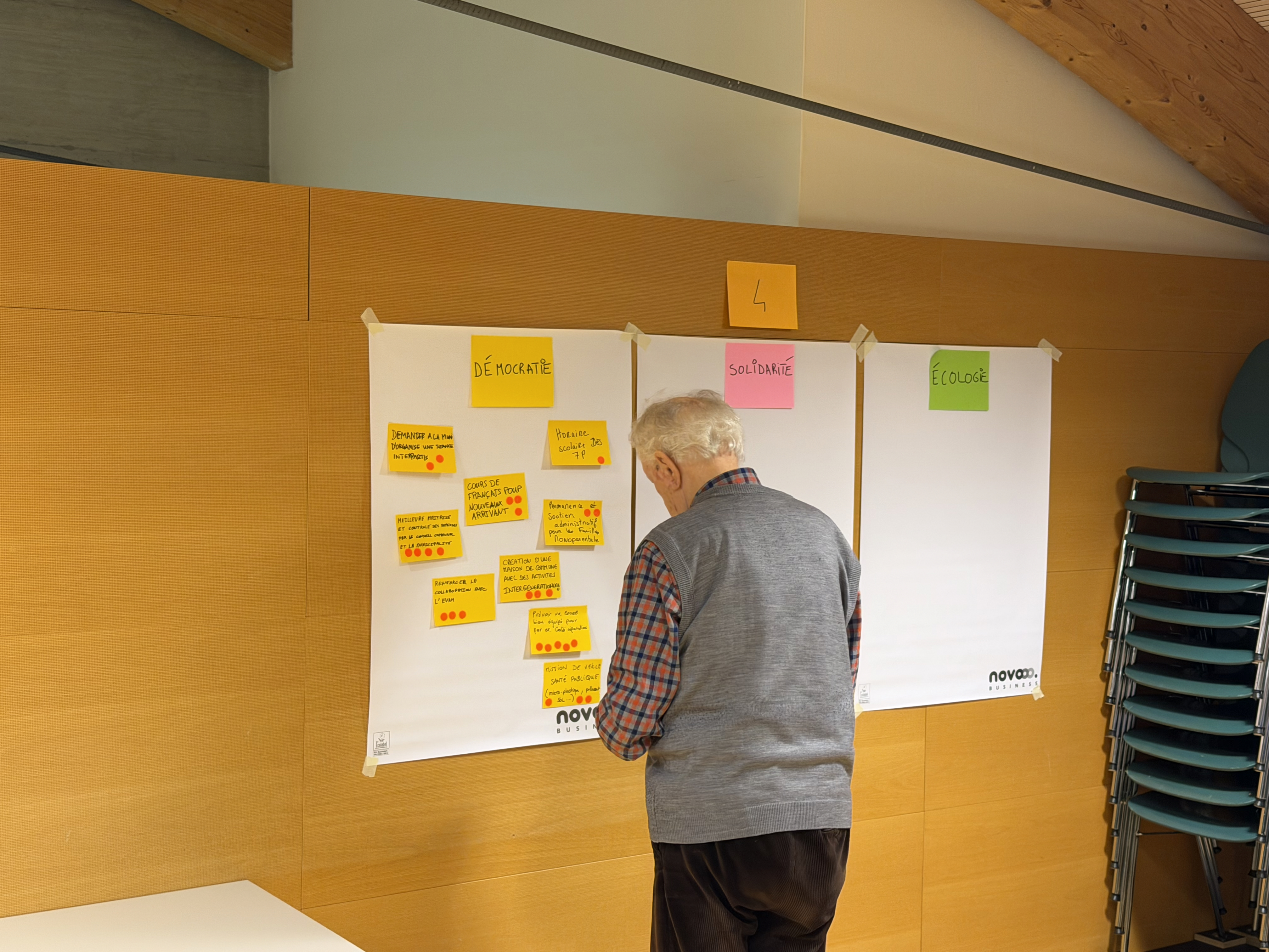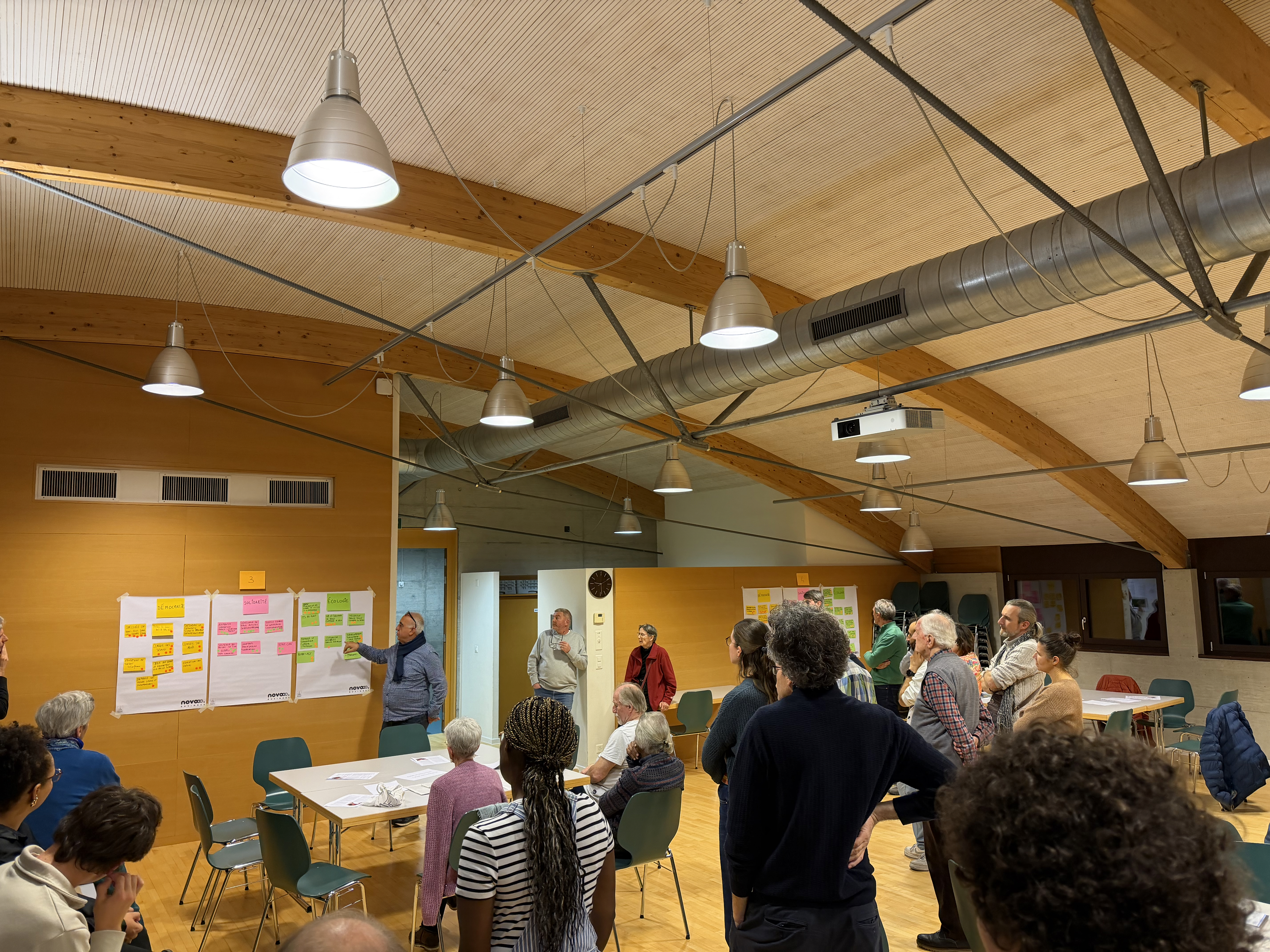La soirée s’est déroulée selon le même synopsis qu’en 2015 et 2021 : chaque groupe a travaillé sur chaque pilier (Démocratie, Solidarité, Écologie) pendant un cycle de 20′ et a présenté ses résultats à toute l’assemblée au terme des 3 cycles. Pendant chaque cycle, les groupes ont décrits leurs idées sur des post-its et votés pour leur priorités avec des gommettes autocollantes.