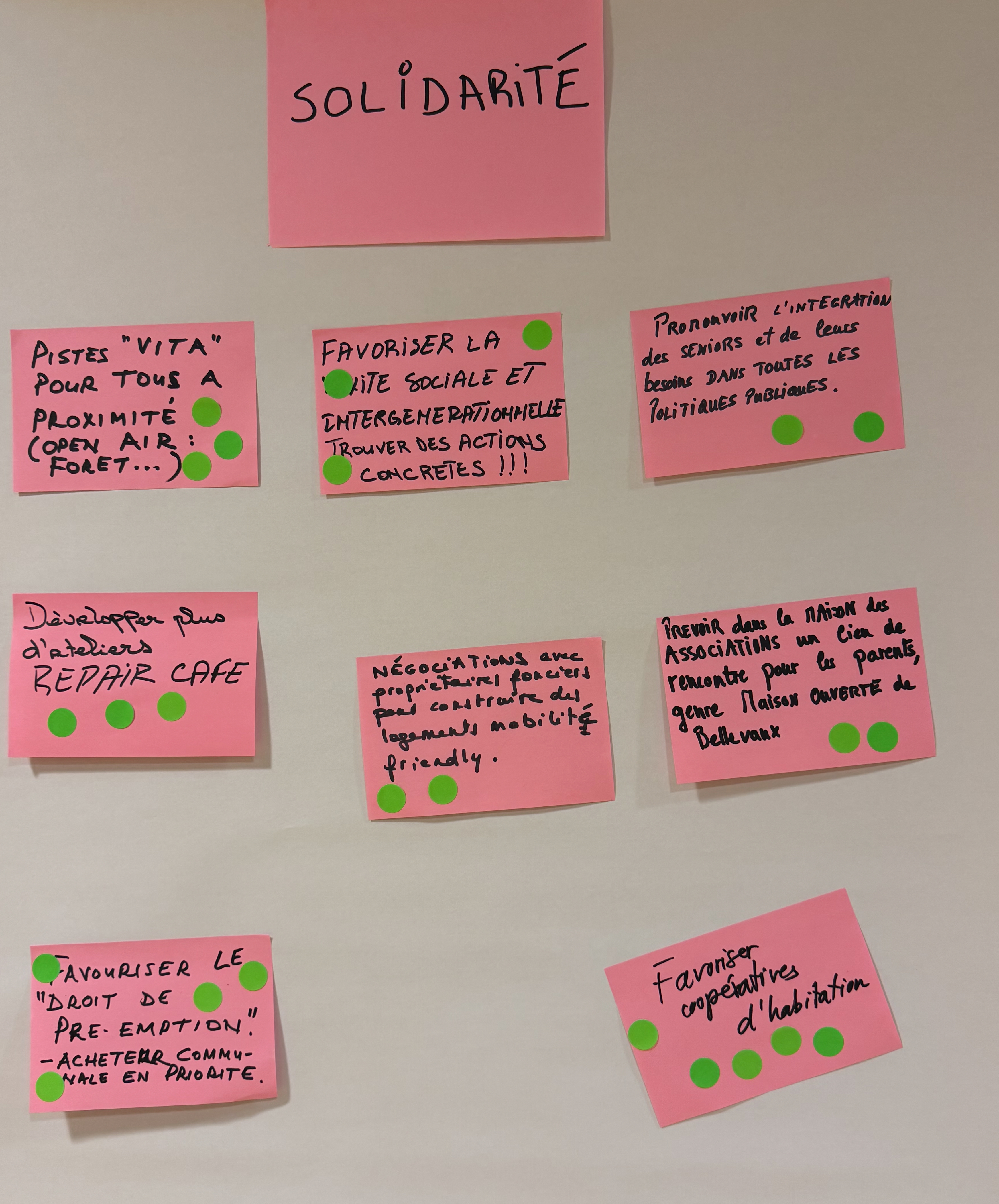 Lorsque les idées étaient similaires, elles ont été regroupées et les votes additionnés (pastilles rouges).