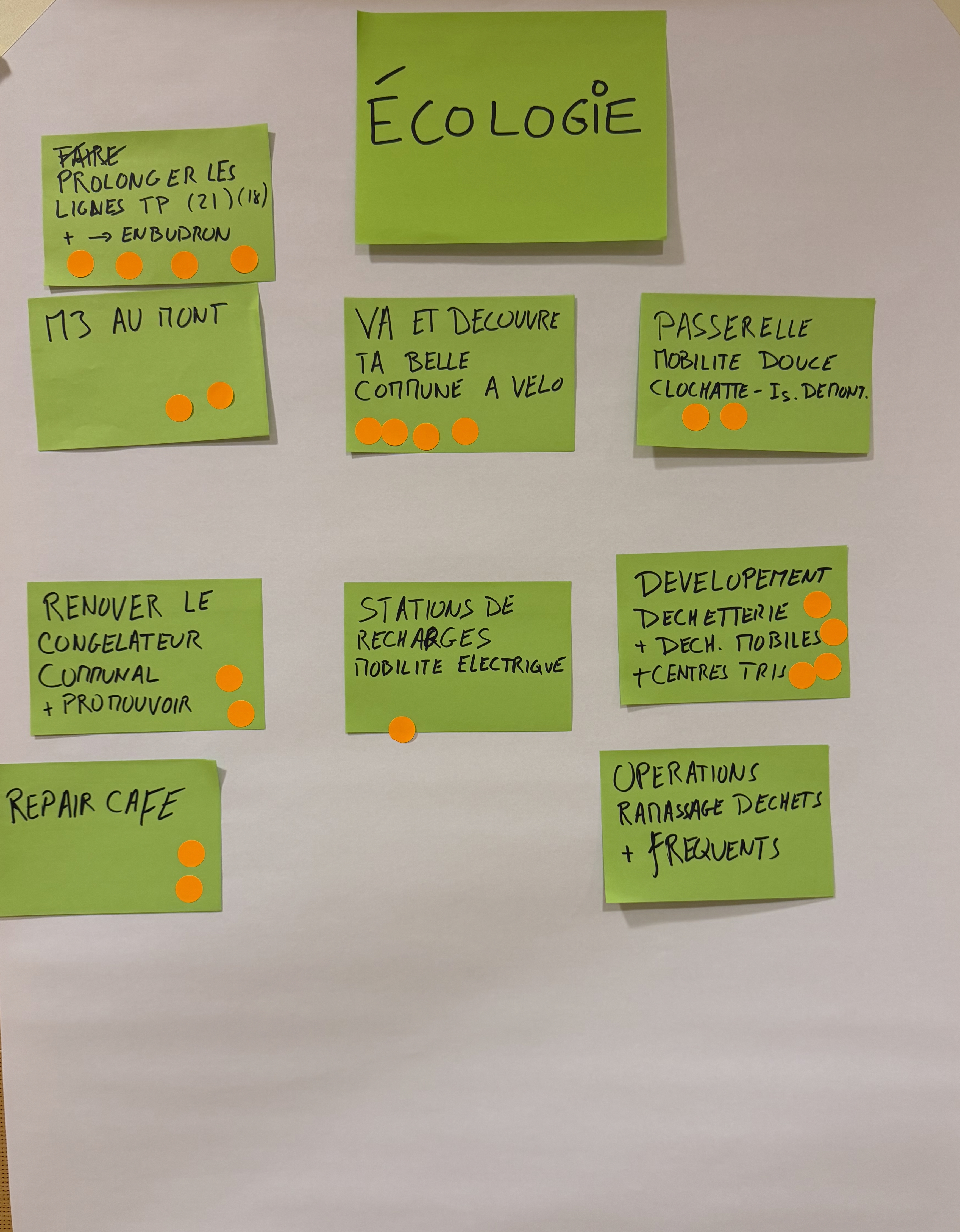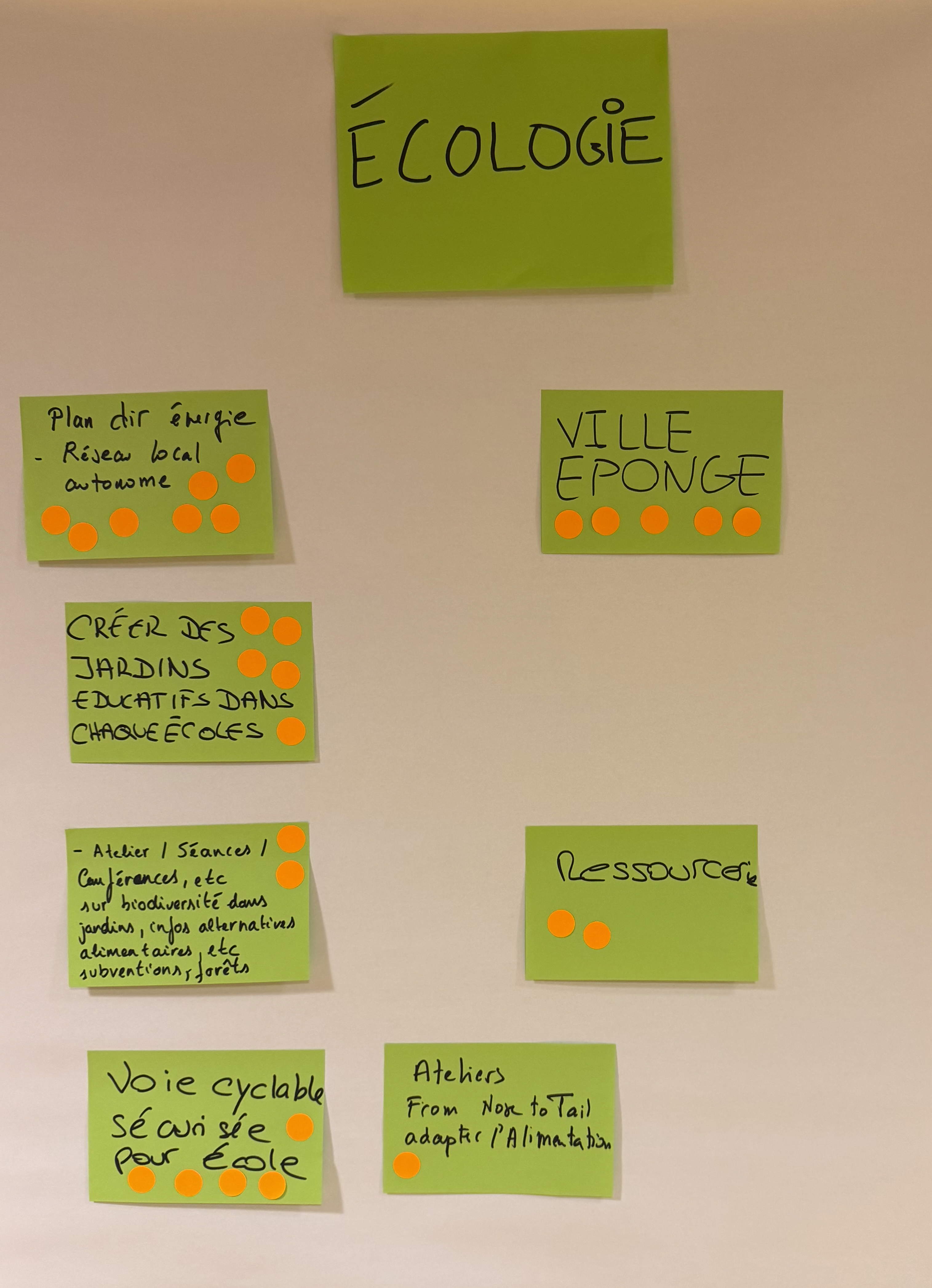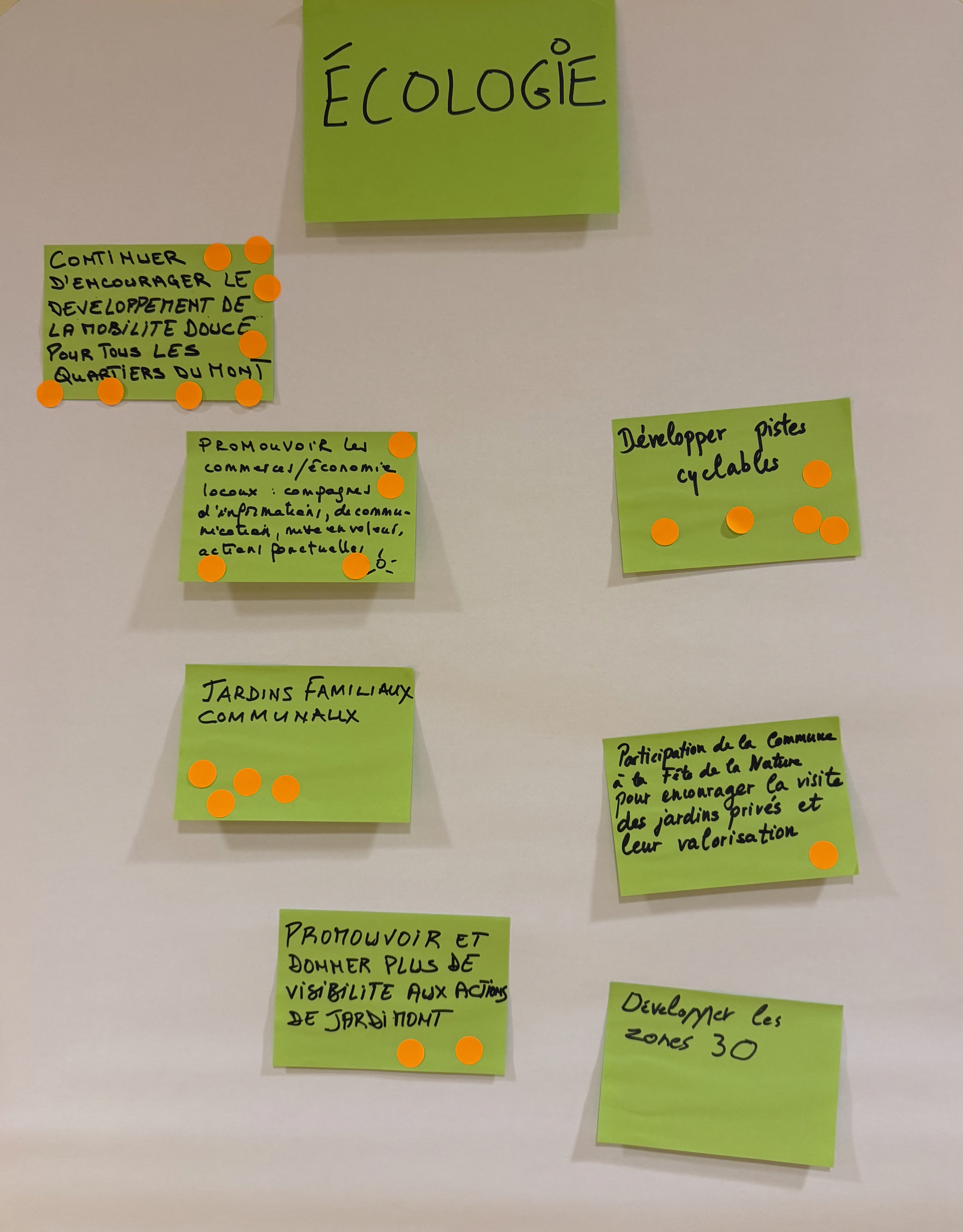 Lorsque les idées étaient similaires, elles ont été regroupées et les votes additionnés (pastilles vertes).