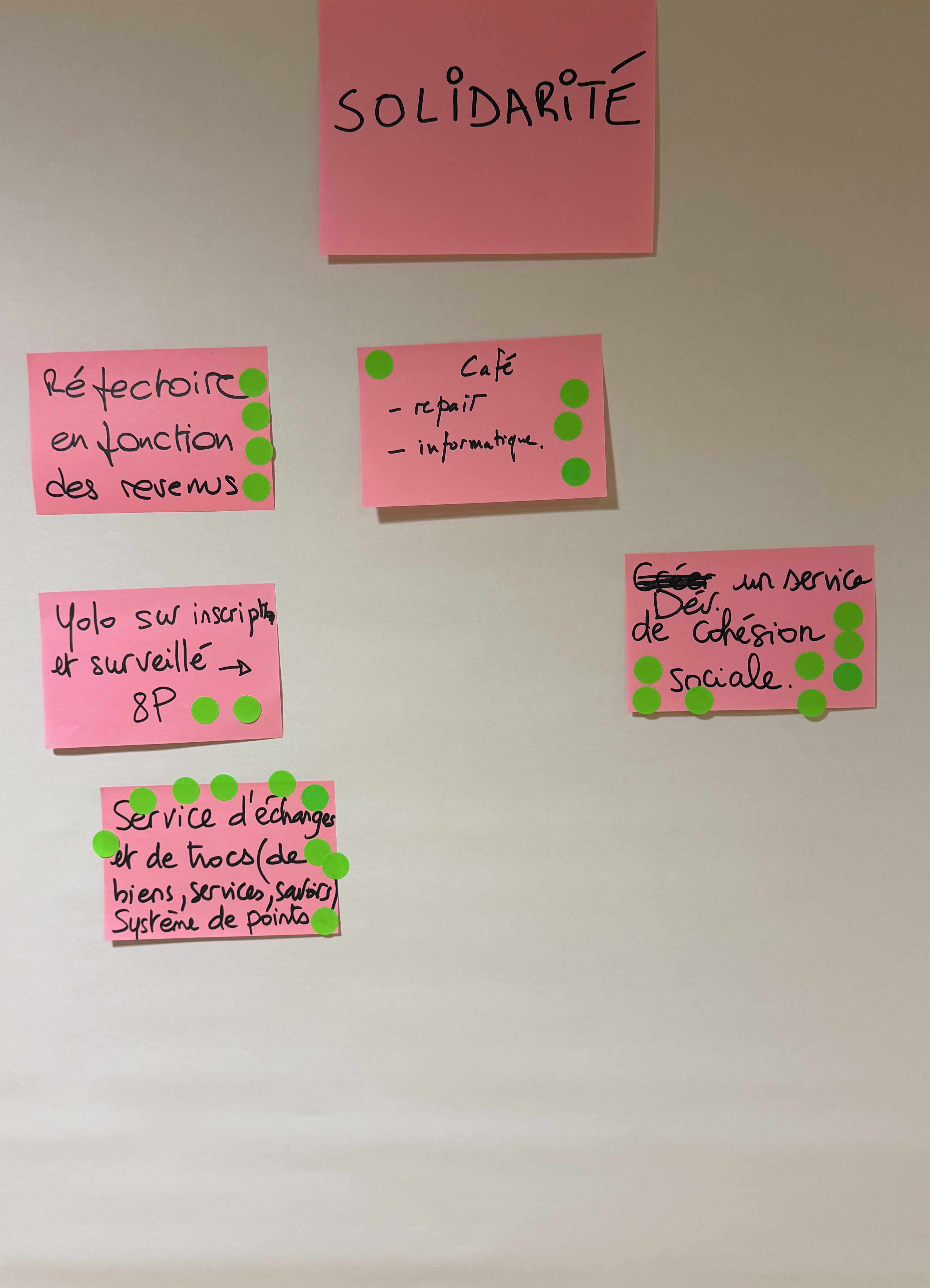 Les travaux se sont matérialisés par la création de 3 posters avec des post-its (jaune pour Démocratie, rose pour Solidarité et vert pour Écologie).