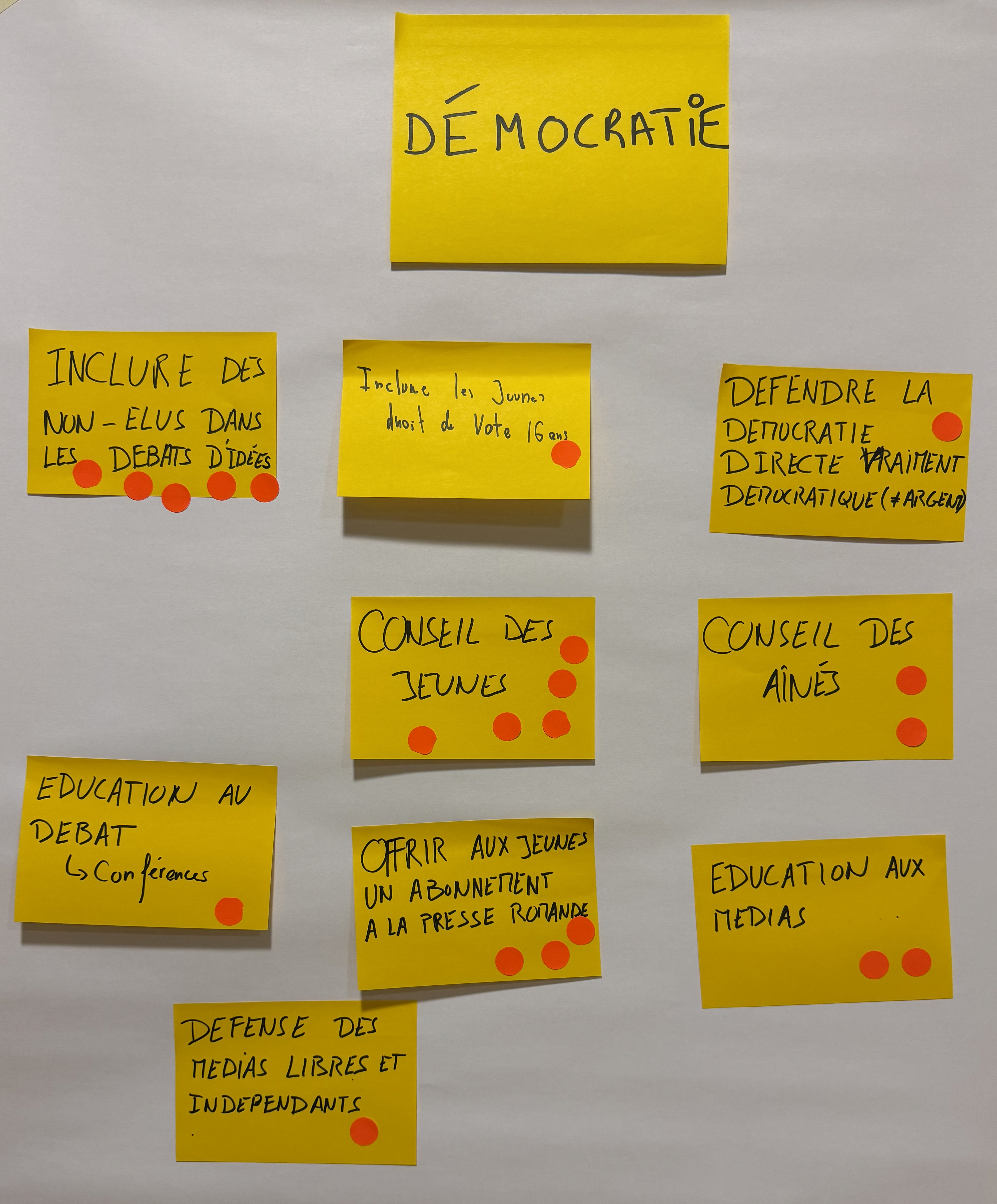 Premier volet des résultats du forum citoyen du 22 janvier 2026 : les priorités concernant le pilier Démocratie. Les photos ci-dessous documentent les résultats de chacun des 4 groupes de travail.