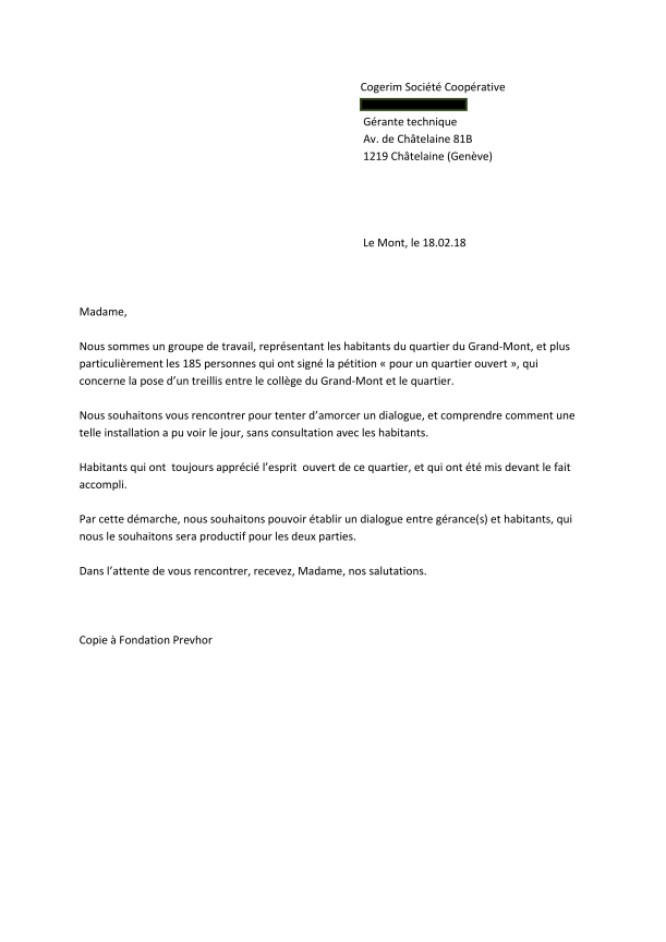 Le groupe de travail a distribué aujourd’hui un tout ménage pour informer les habitants du quartier du bilan de leur action. Ils nous ont demandé de publier la chronologie de leurs actions et les courriers qu’ils ont échangé avec les gérances concernées par la barrière du Grand-Mont.