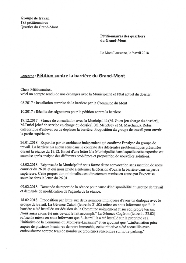 Les 185 signataires de la pétition contre la barrière du Grand-Mont nous ont demandé de publier leur lettre du 26 janvier dernier adressée à la Municipalité. Pour télécharger la lettre au format PDF, merci de cliquer ICI.