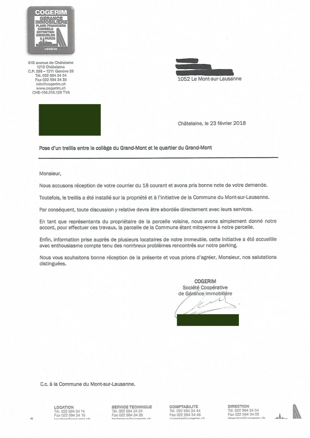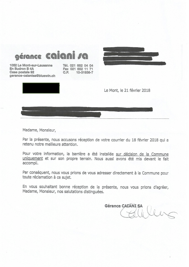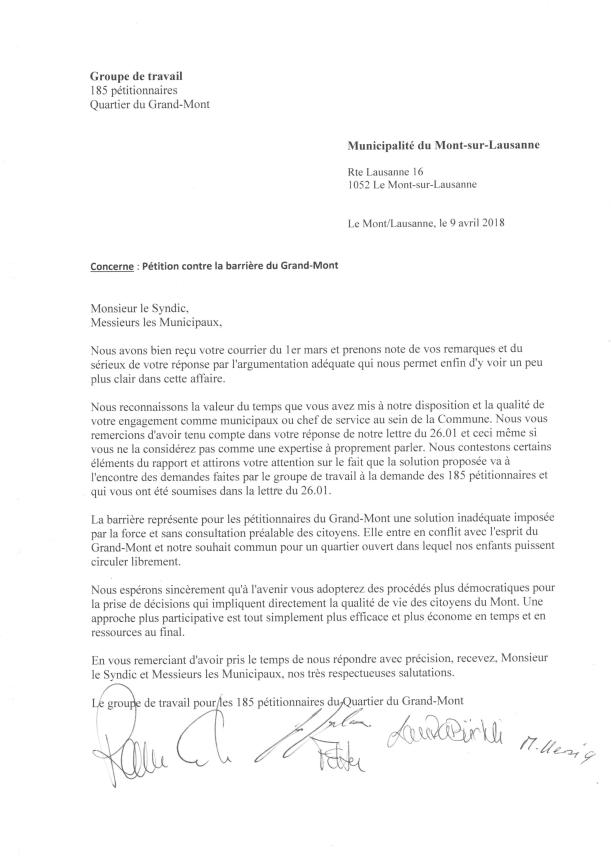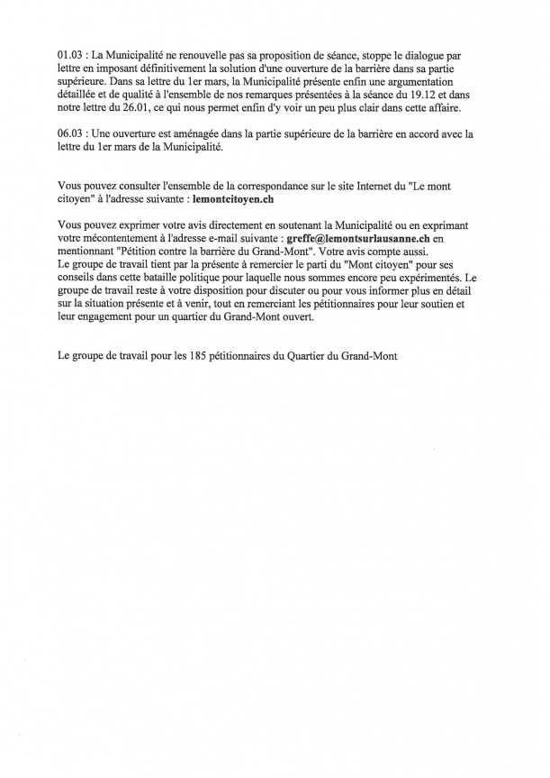 Les 185 signataires de la pétition contre la barrière du Grand-Mont nous ont demandé de publier la réponse de la Municipalité à leur lettre du 26 janvier dernier. Il est important de noter que les pétitionnaires ne sont pas satisfaits par cette réponse.