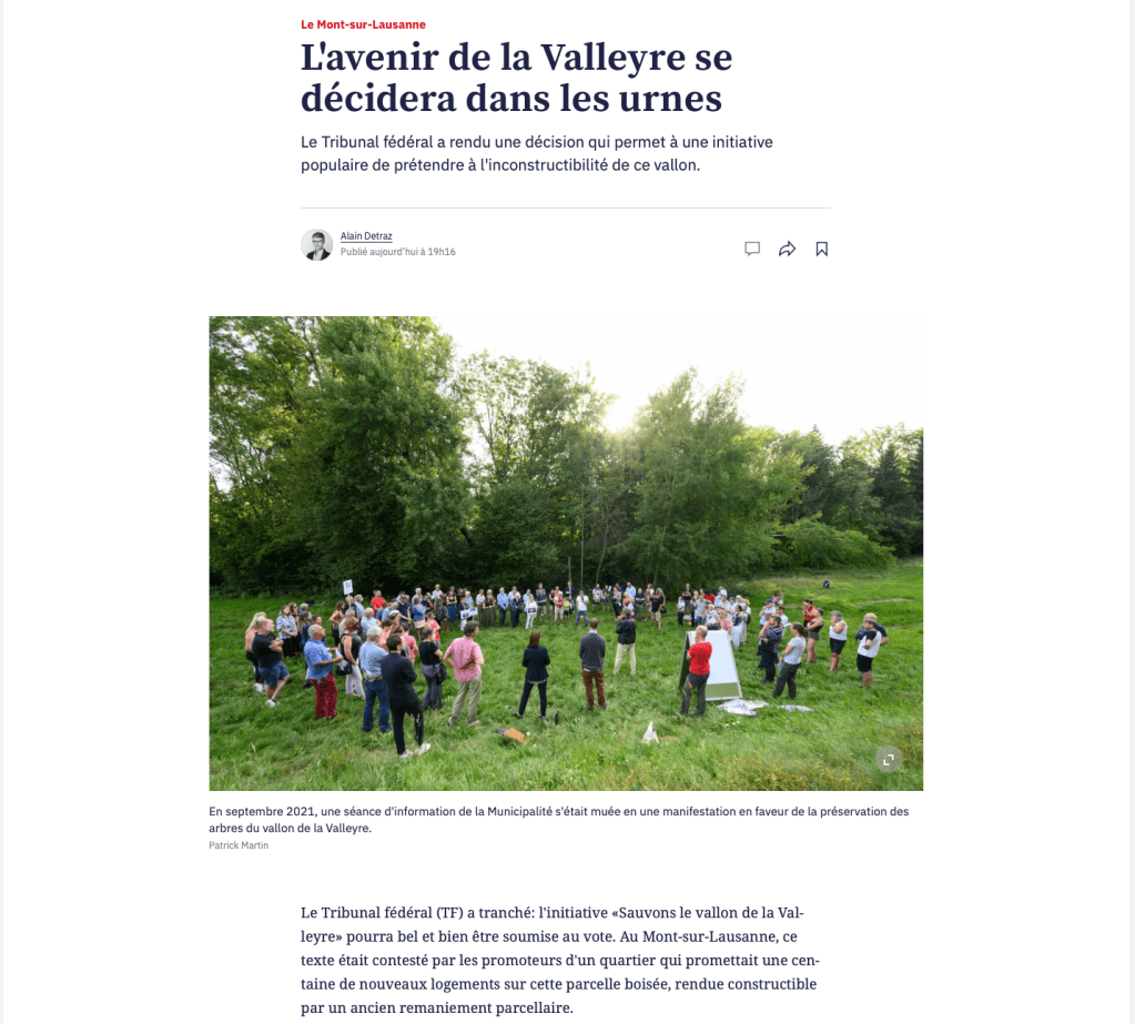 24 heures revient dans son édition d’aujourd’hui sur la décision du Tribunal fédéral d’autoriser l’initiative « Sauvons le vallon de la Valleyre » à poursuivre son parcours démocratique : elle passera devant le Conseil communal et peut être même devant la population si le Conseil la refuse.