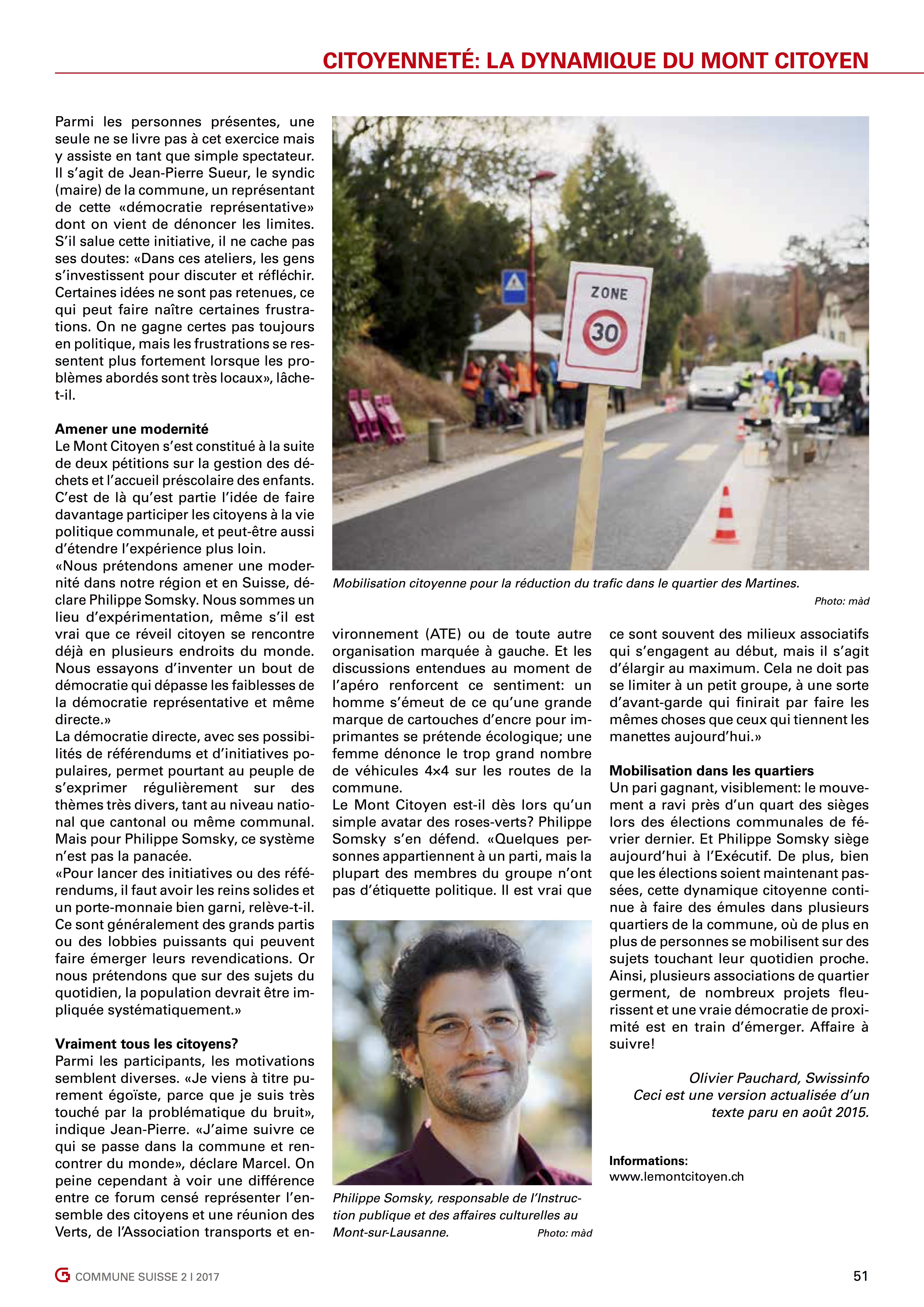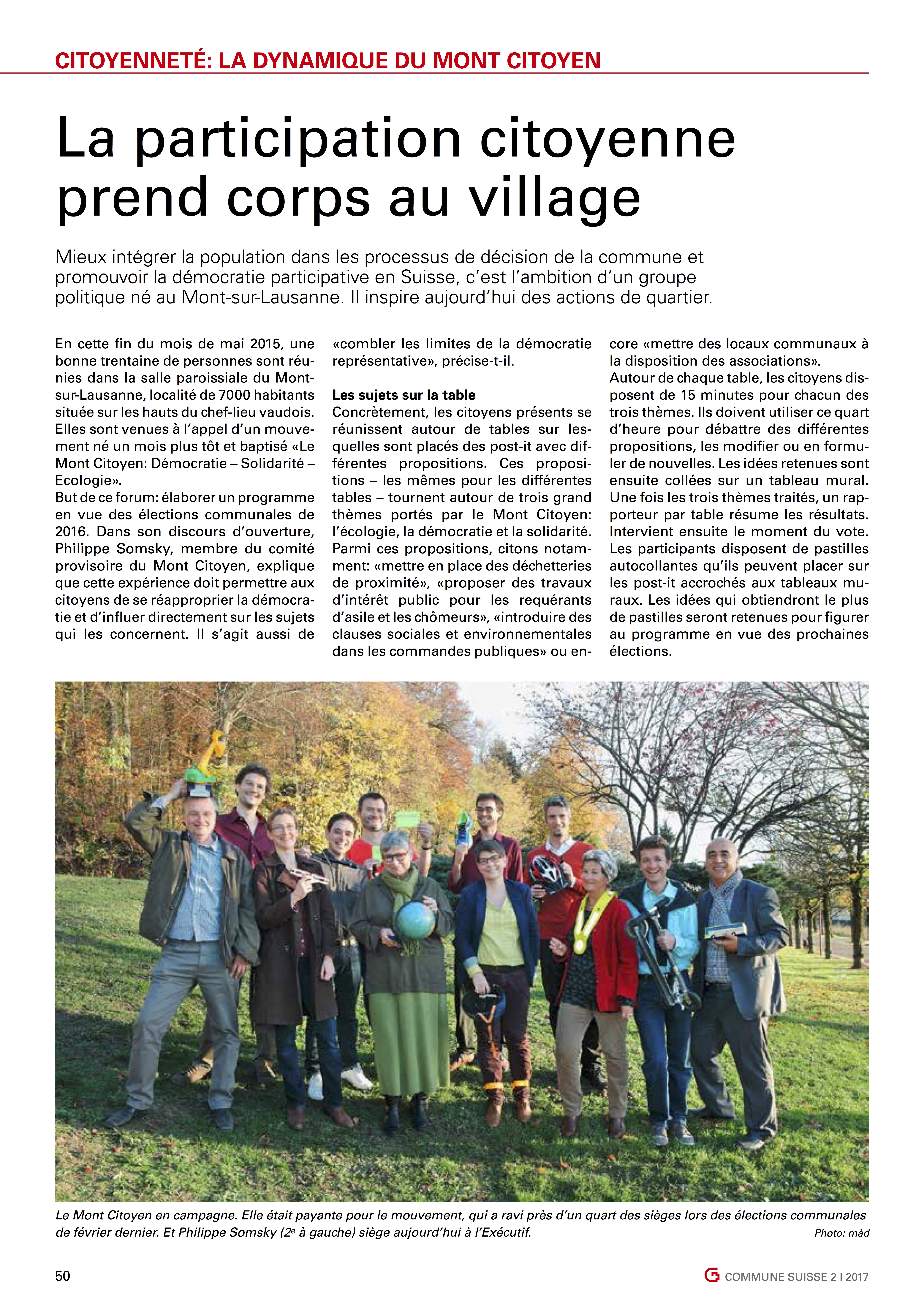L’Association des Communes Suisses a publié un article sur le Mont Citoyen dans le dernier numéro de son magazine Commune Suisse. Cet article retrace la genèse du Mont Citoyen et le vent de changement qui souffle sur la Commune.