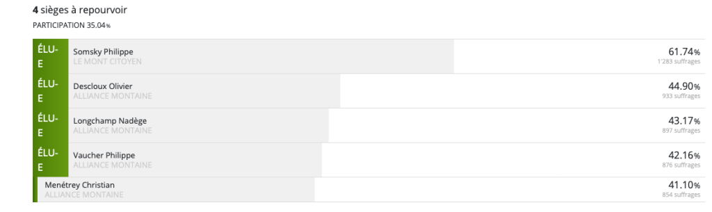À la Municipalité, les résultats sont plus mitigés. Dans ce scrutin majoritaire à 2 tours, l’Alliance Montaine ne parvient à faire élire qu’une seule candidate au 1er tour malgré un taux de participation assez faible autour de 43%.