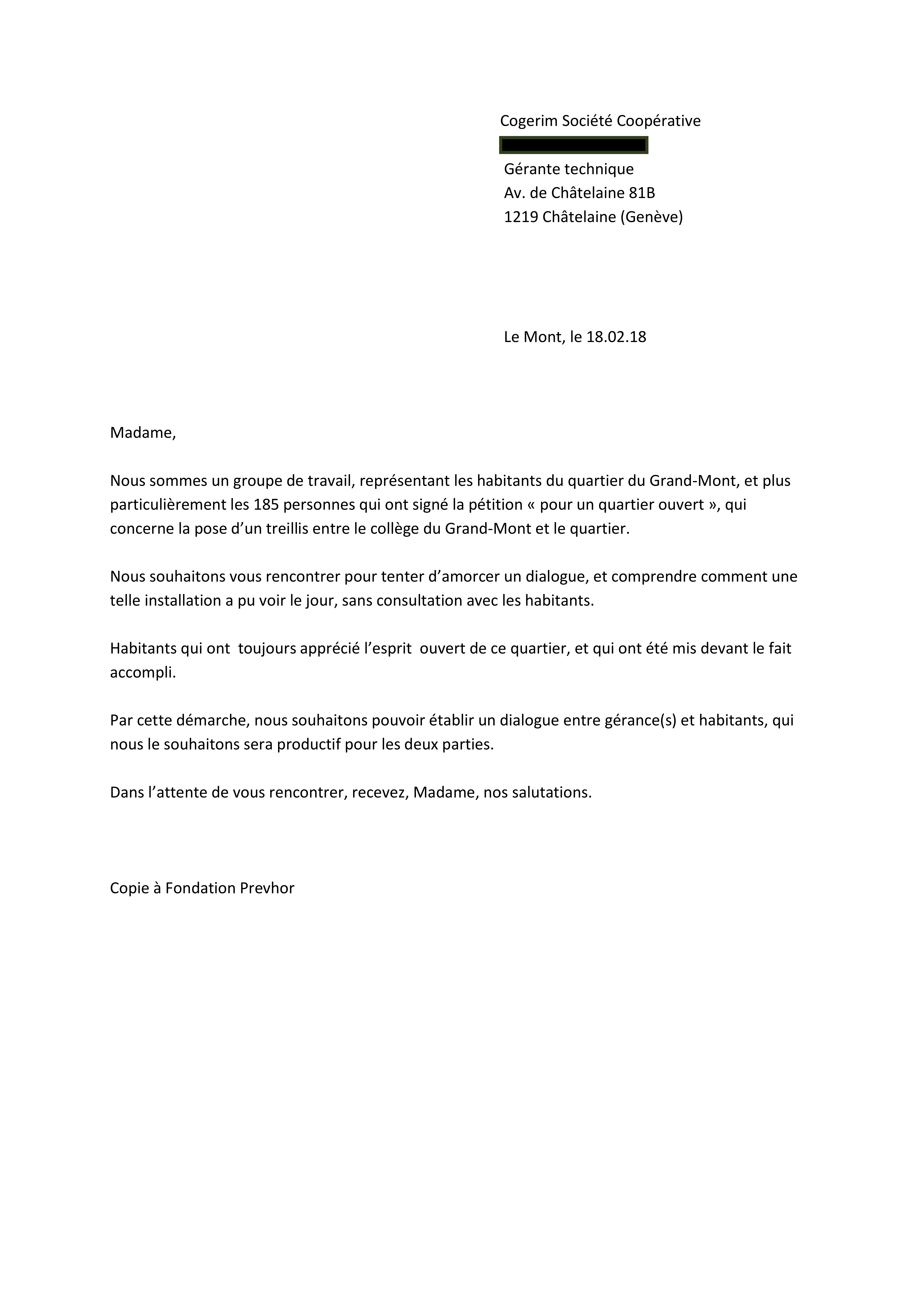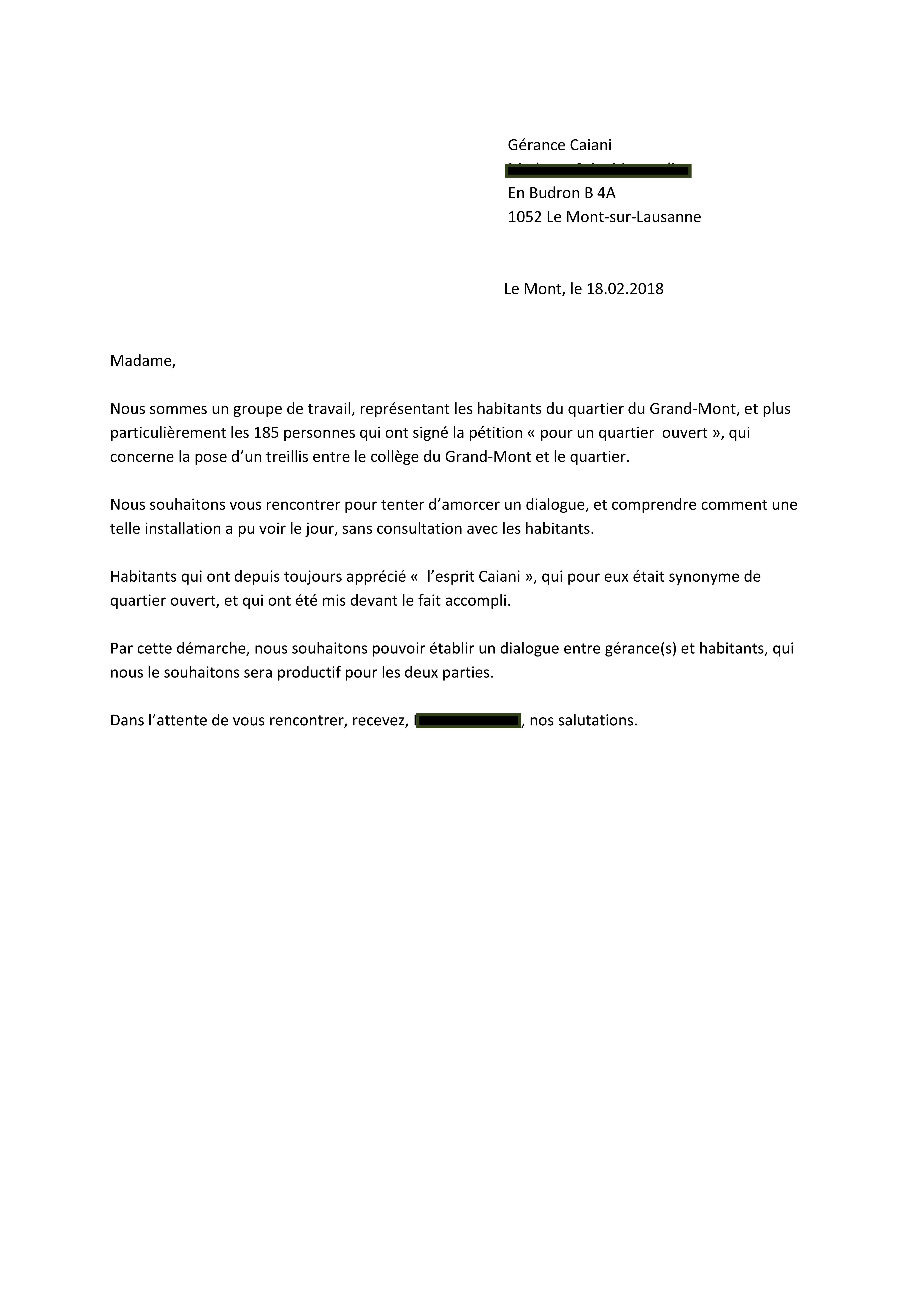 Les 185 signataires de la pétition contre la barrière du Grand-Mont nous ont demandé de publier leur lettre du 26 janvier dernier adressée à la Municipalité. Pour télécharger la lettre au format PDF, merci de cliquer ICI.