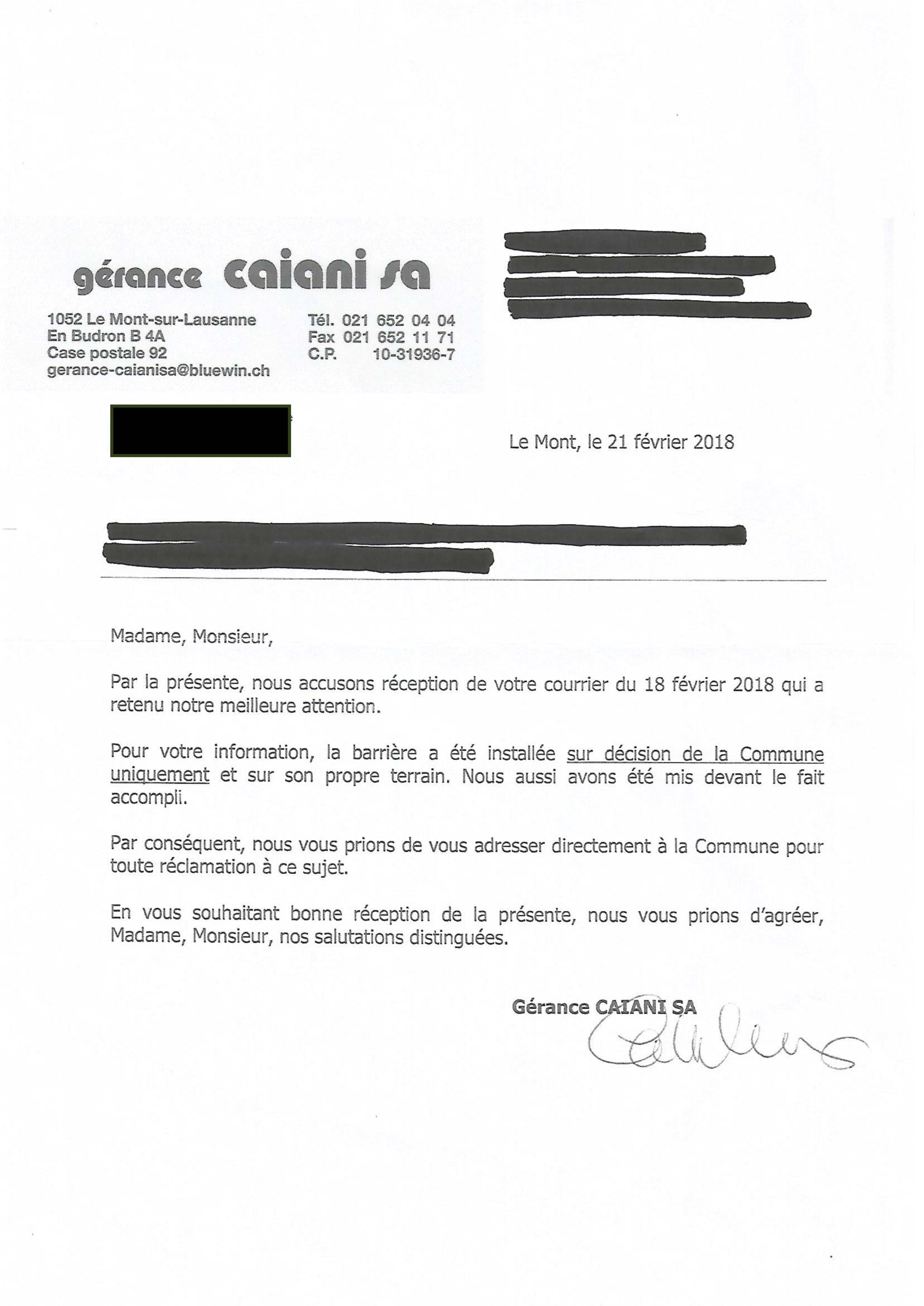 Les 185 signataires de la pétition contre la barrière du Grand-Mont nous ont demandé de publier la réponse de la Municipalité à leur lettre du 26 janvier dernier. Il est important de noter que les pétitionnaires ne sont pas satisfaits par cette réponse.