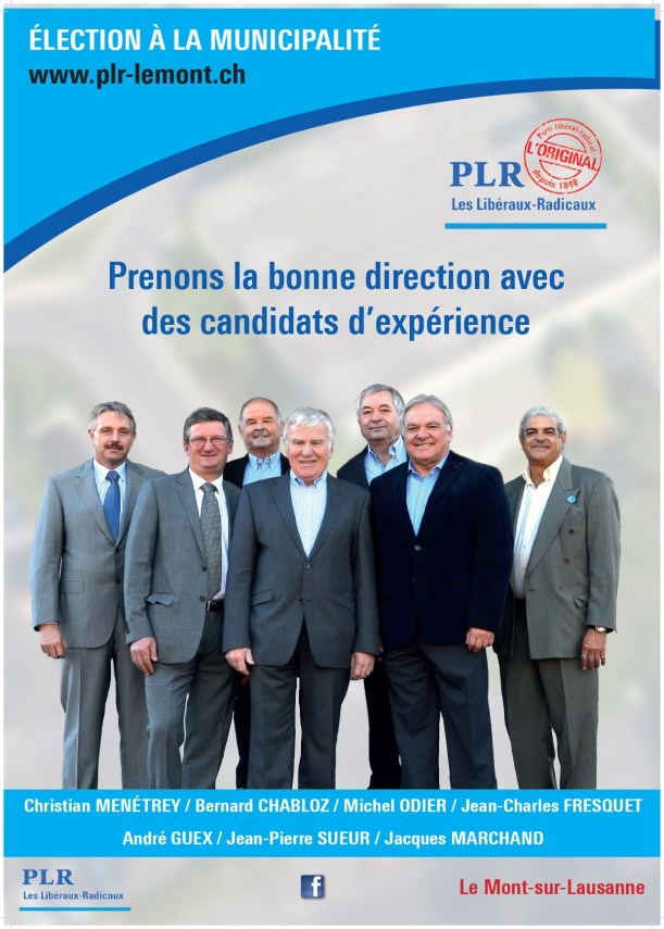 • En 2016, comme le montre l’affiche de campagne ci-dessous, le PLR « envoyaient » 7 hommes pour conquérir la municipalité ; deux ans plus tard, le même parti met en avant une candidature féminine. Pourquoi ne pas avoir pas fait cela il y a deux ans ? Opportunisme électoral semble être le bon terme…
