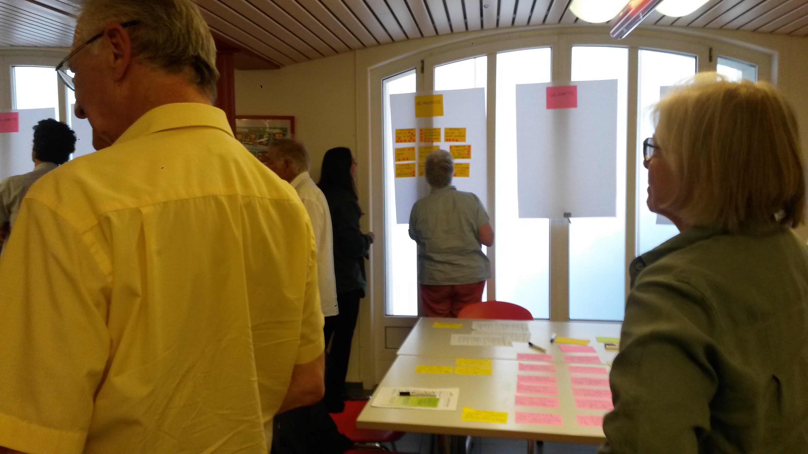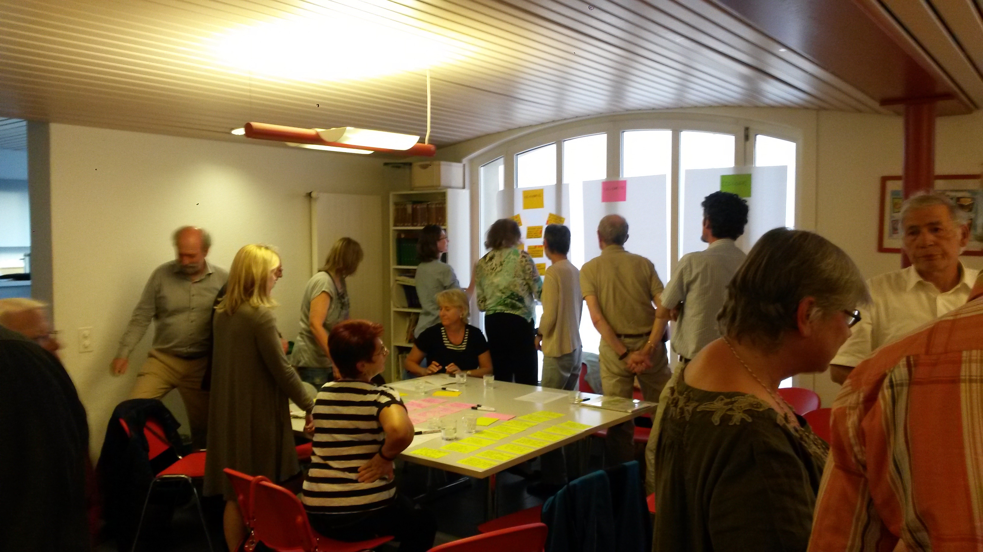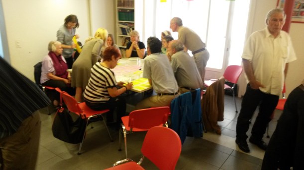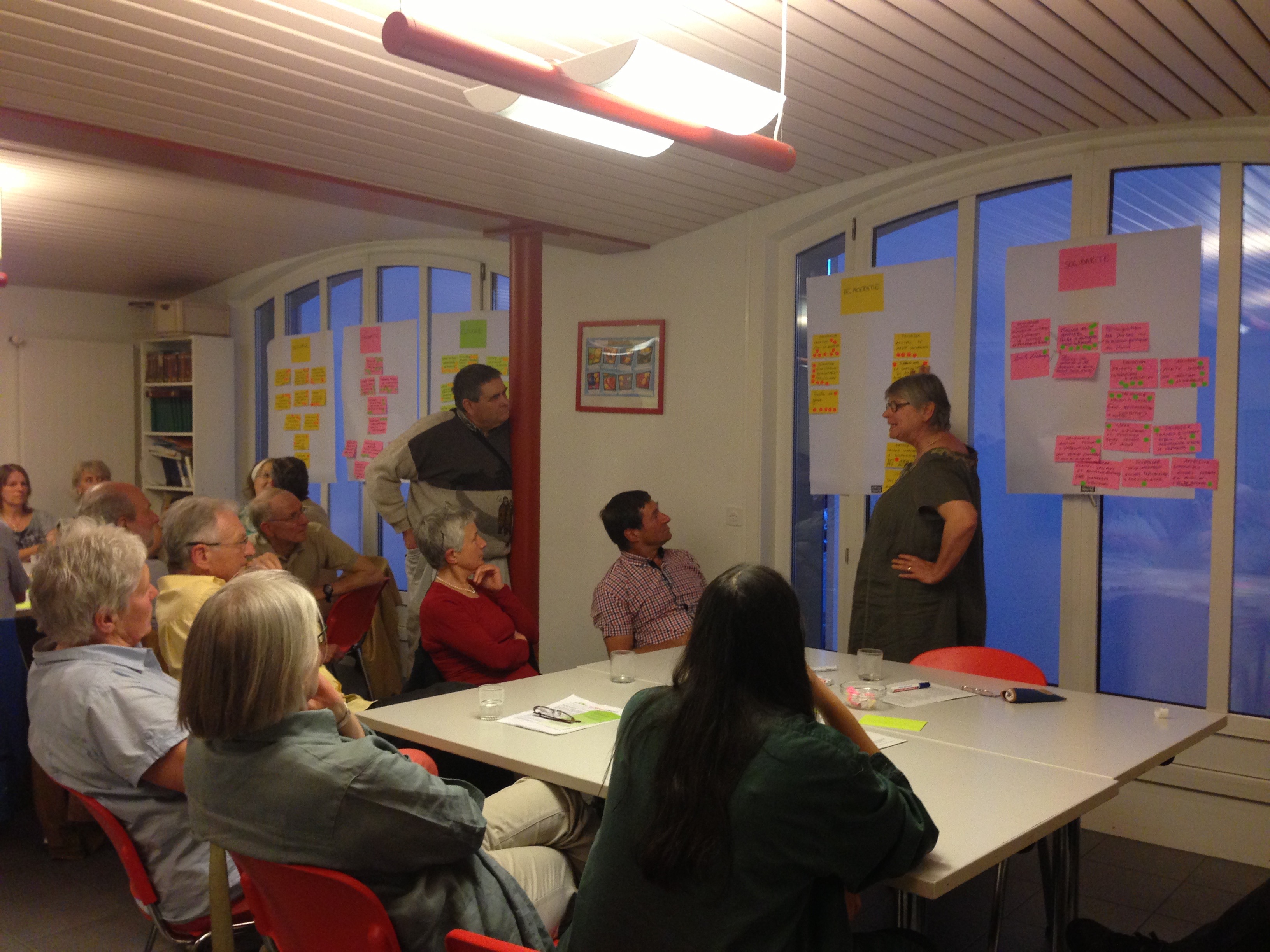 Plus de 40 participants se sont retrouvés dans une salle de paroisse bondée et surchauffée pour travailler en groupes, avec des post-its, sur les 3 piliers Démocratie, Solidarité, Écologie.