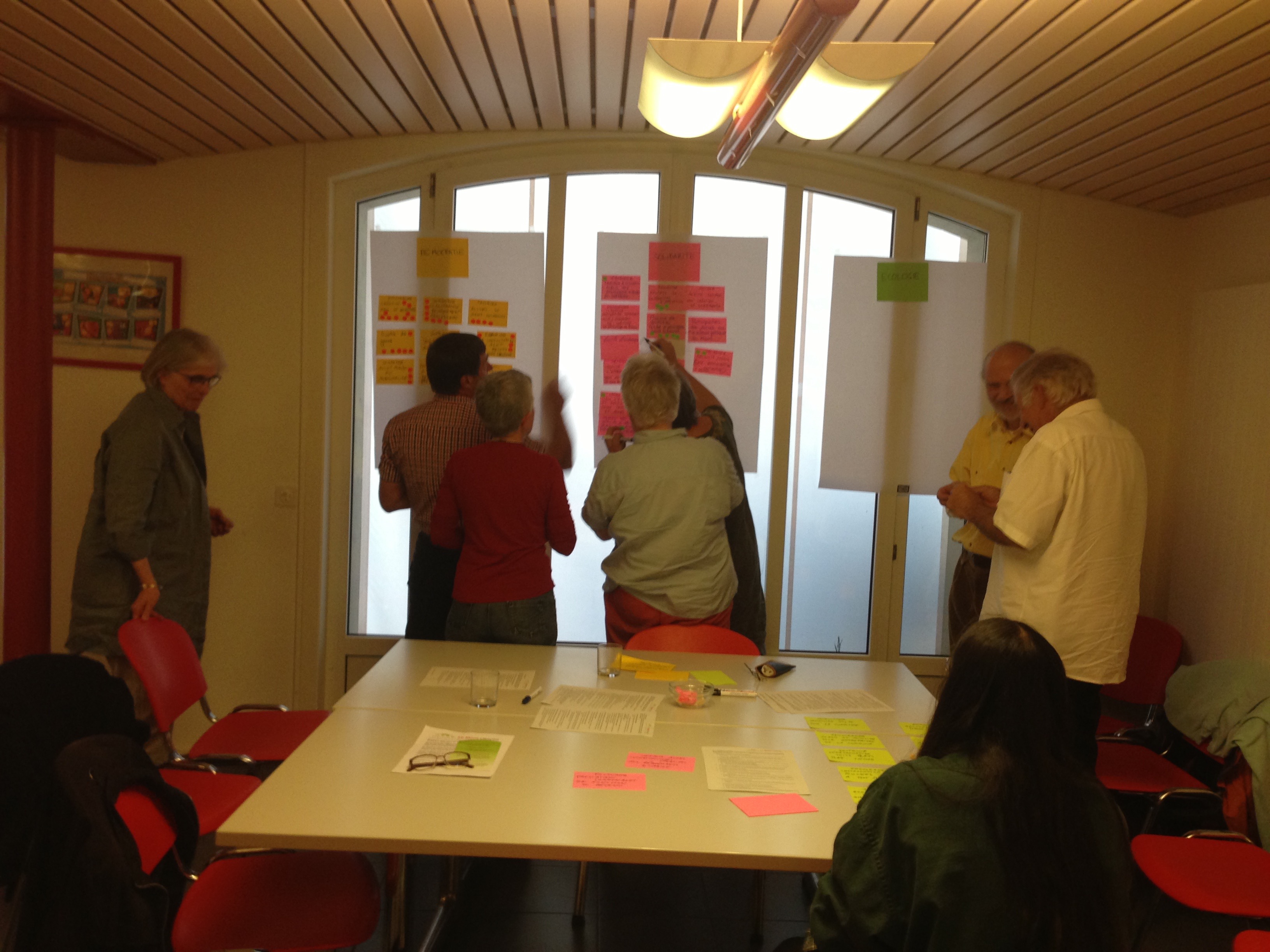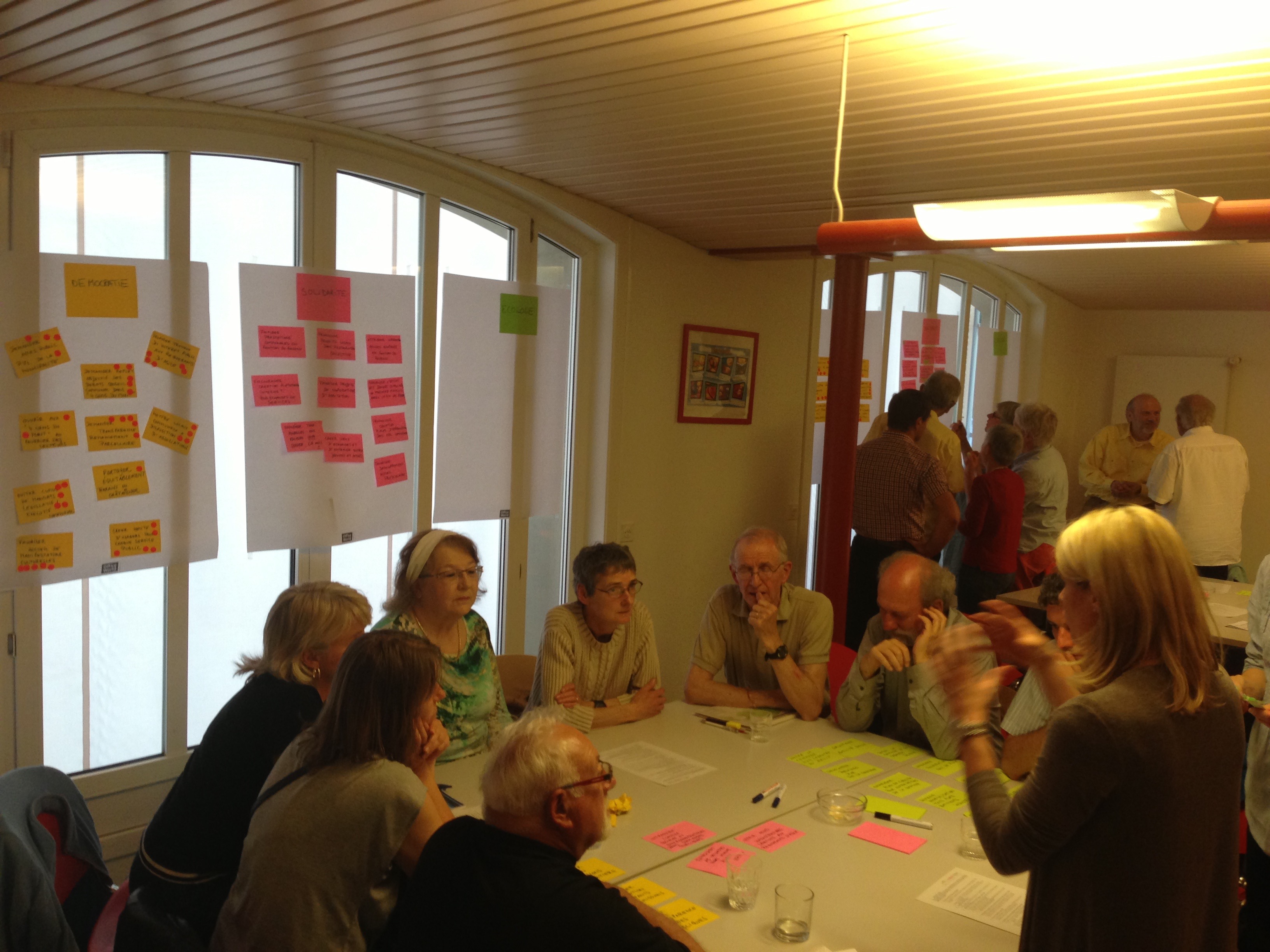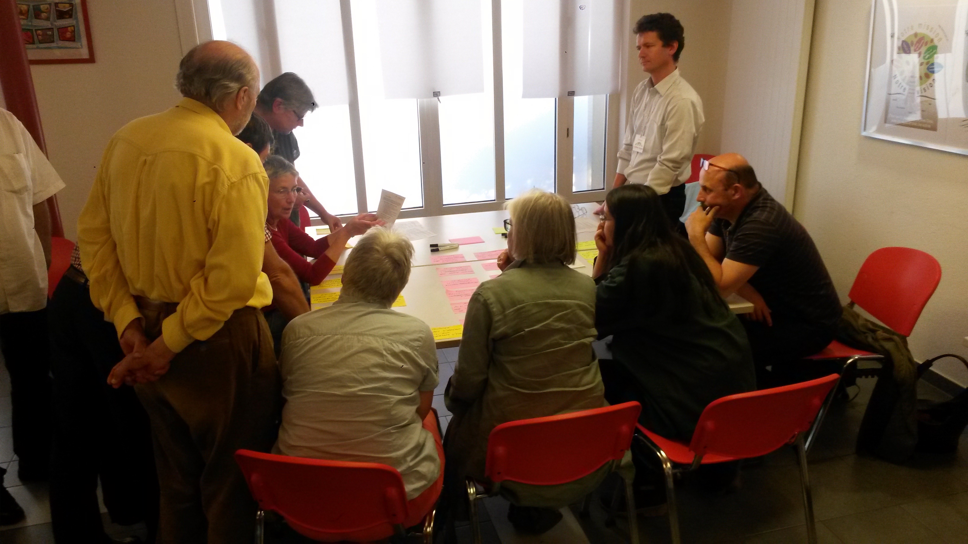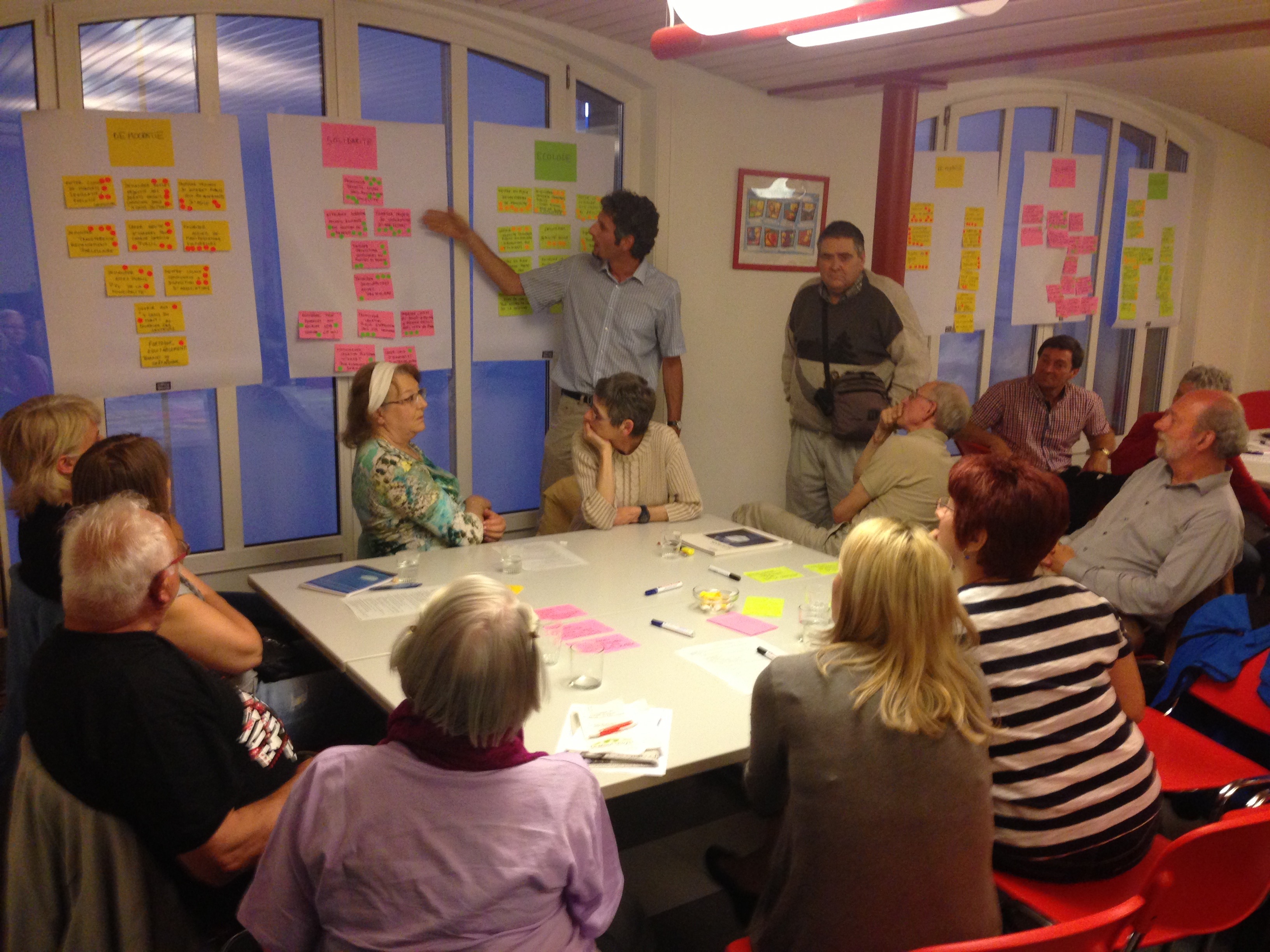 Plus de 40 participants se sont retrouvés dans une salle de paroisse bondée et surchauffée pour travailler en groupes, avec des post-its, sur les 3 piliers Démocratie, Solidarité, Écologie.